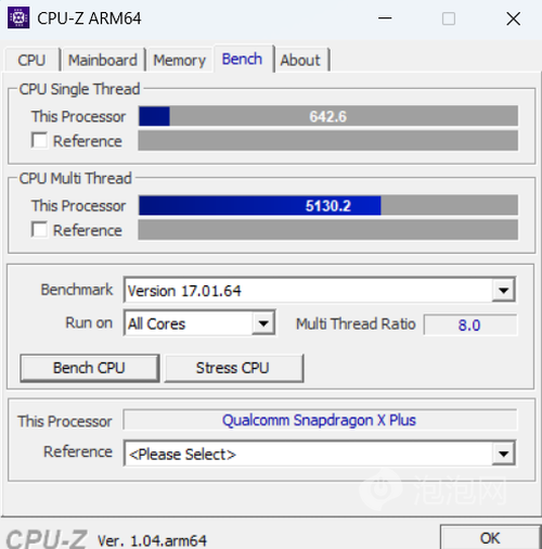 由于ARM架构的软件生态正在完善当中,可能有些软件并未完成原生开发,因此需要转译处理。我们也通过转译的方式来进行了CPU的测试,在X86版本的CPU-Z测试下,SnapdragonXPlus的单核成绩为457.5,多核成绩为3667.3。与ARM原生版本相比,性能下降了28%左右。