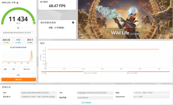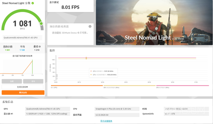 GPU方面,SurfaceLaptop,13英寸配备的是AdrenoGPU,目前3DMark并未推出ARM版本,所以在转译模式下,我们测试了SteelNomadLight和WildLifeExtreme,成绩分别是1081和11434。