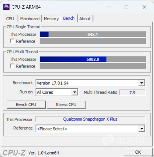 在不插电的情况下,CPU-Z的单核成绩为642.1,多核成绩为5082.9,性能差异非常小。