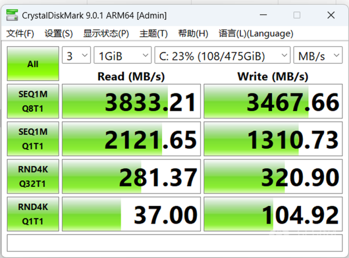 SSD的测试使用ARM版的CrystalDiskMark,经过实测读取速度为3833.21MB/s,写入速度为3467.66MB/s。