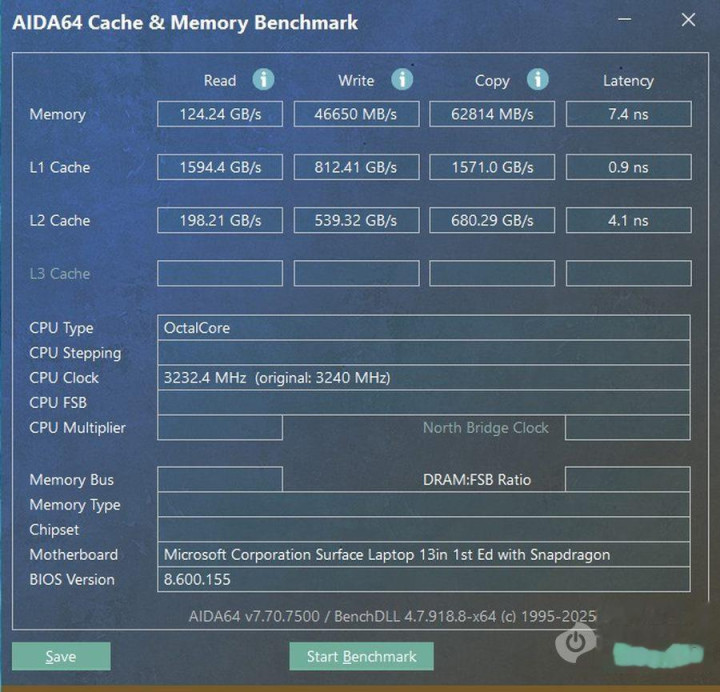 内存方面,使用AIDA64来进行测试,同样是在转译下测试,并不能完全显示设备信息,测试数据仅供参考。