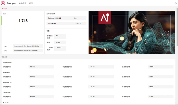 SurfaceLaptop,13英寸的AI能力使用AIComputerVisionBenchmark来进行测试,其成绩为1748分,也是一个非常不错的成绩,在日常AI应用上,SurfaceLaptop,13英寸可以为用户提供良好的性能支持。